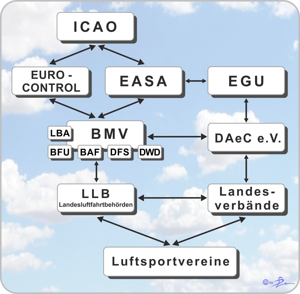 Die Vorschriften für die Luftfahrt haben einen starken internationalen Charakter, nicht nur in Europa, sondern auch weltweit. Die Regeln sind in fast allen Ländern ähnlich. Die Abbildung unten zeigt von oben nach unten, welche Organisationen an der Regulierung der Luftfahrt beteiligt sind.