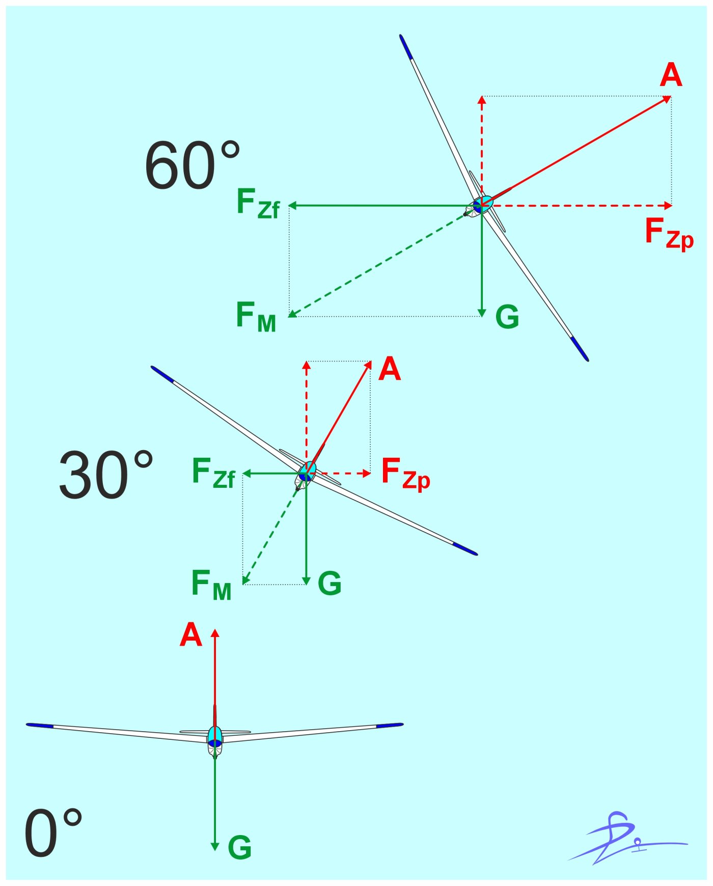 Mit größer werdender Querneigung geht die Auftriebserhöhung und somit die Geschwindigkeitserhöhung einher