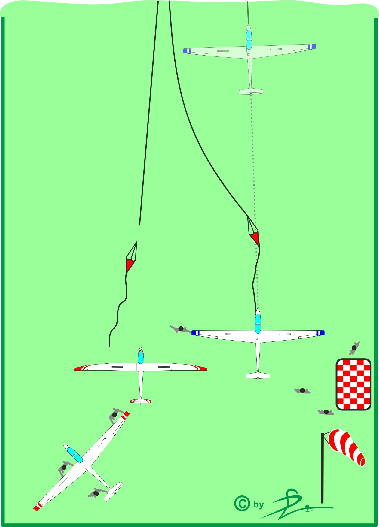Zum Startcheck gehört auch die Beachtung von Windrichtung und -stärke. So kannst du feststellen, ob es Seitenwind gibt. Starten mit Seitenwind kommt immer wieder vor und dann musst du vorhalten, manchmal mehr, manchmal weniger. An Segelflugzeugen, die vor dir starten, kannst du feststellen, wie viel du vorhalten musst. Du hältst genügend vor, wenn das herabfallende Windenseil innerhalb des Flugplatzes landet.