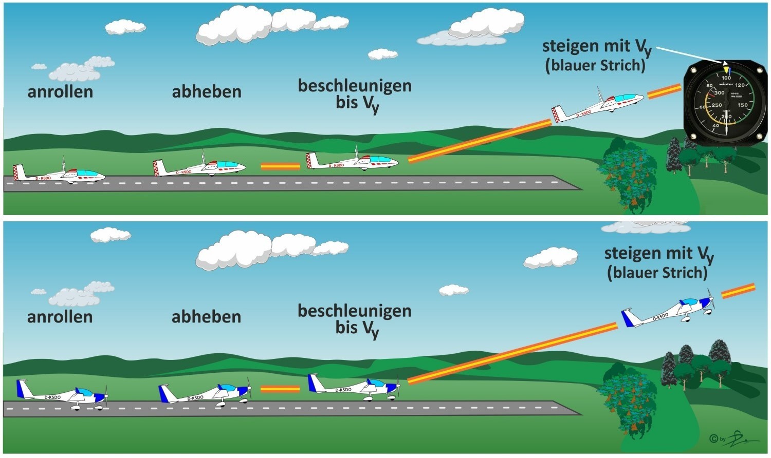 Beim Start (1) beschleunigt das Luftfahrzeug und hebt dann den Bug an. Nach dem Abheben beschleunigt es auf die Geschwindigkeit mit sicherer Steiggeschwindigkeit. Nach Erreichen einer Sicherheitshöhe über Grund endet der Anfangssteigflug und die Leistung wird etwas gedrosselt / die Flugbahn wird etwas flacher.