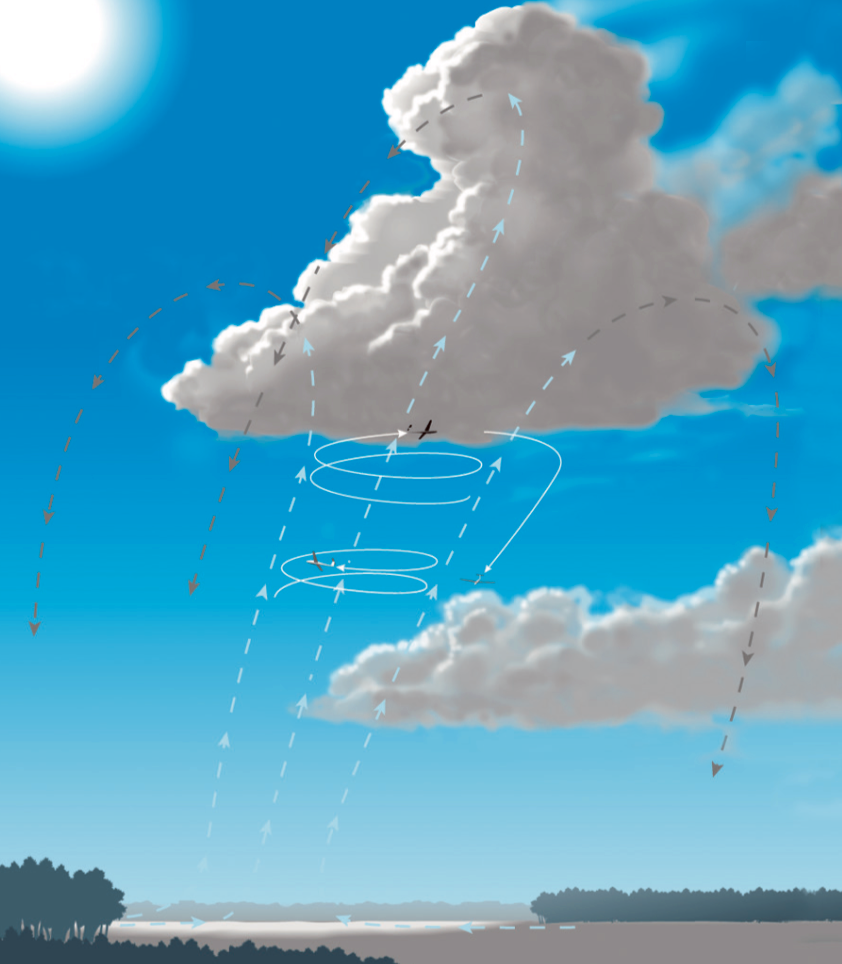 In der Thermik - das ist aufsteigende Warmluft - kannst du mit einem Segelflugzeug kreisend Höhe gewinnen. Oft wird Thermik durch eine Cumuluswolke markiert. Segelflieger bezeichnen Thermik als Bart. Wenn du von einem Bart zum nächsten fliegst und erneut Höhe gewinnst, kannst du große Strecken zurücklegen.