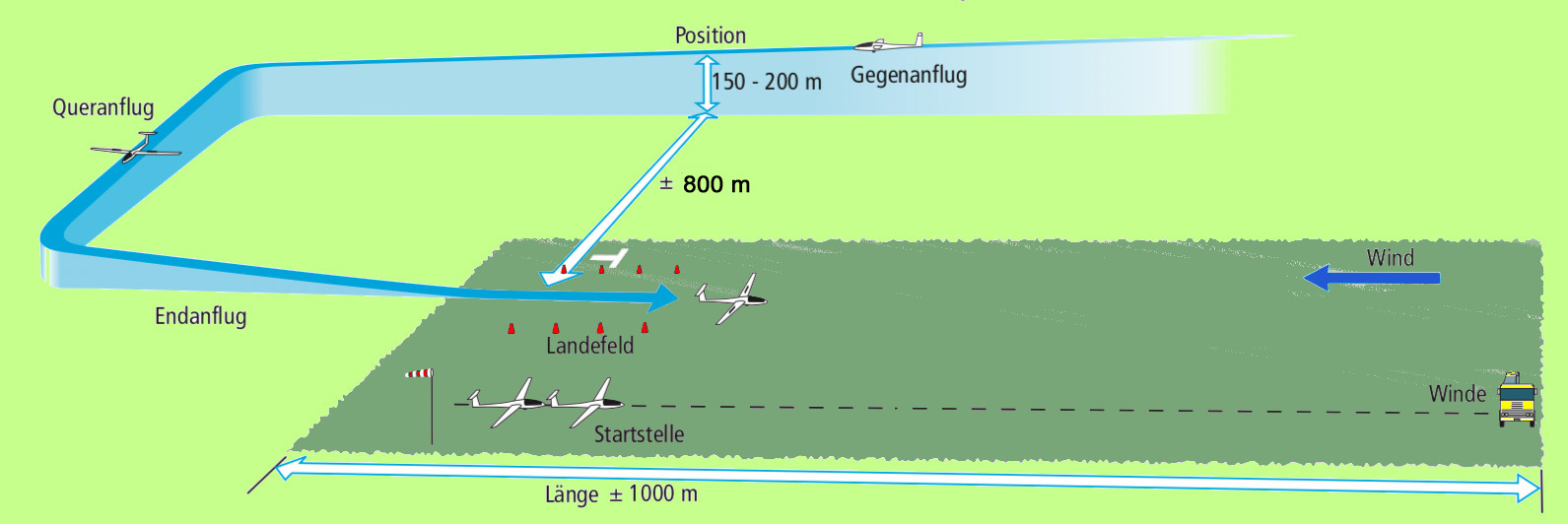 Eine gute Landung beginnt mit der richtigen Einteilung der Platzrunde. Die Details zur Platzrunde kannst du aus dem Bild entnehmen.