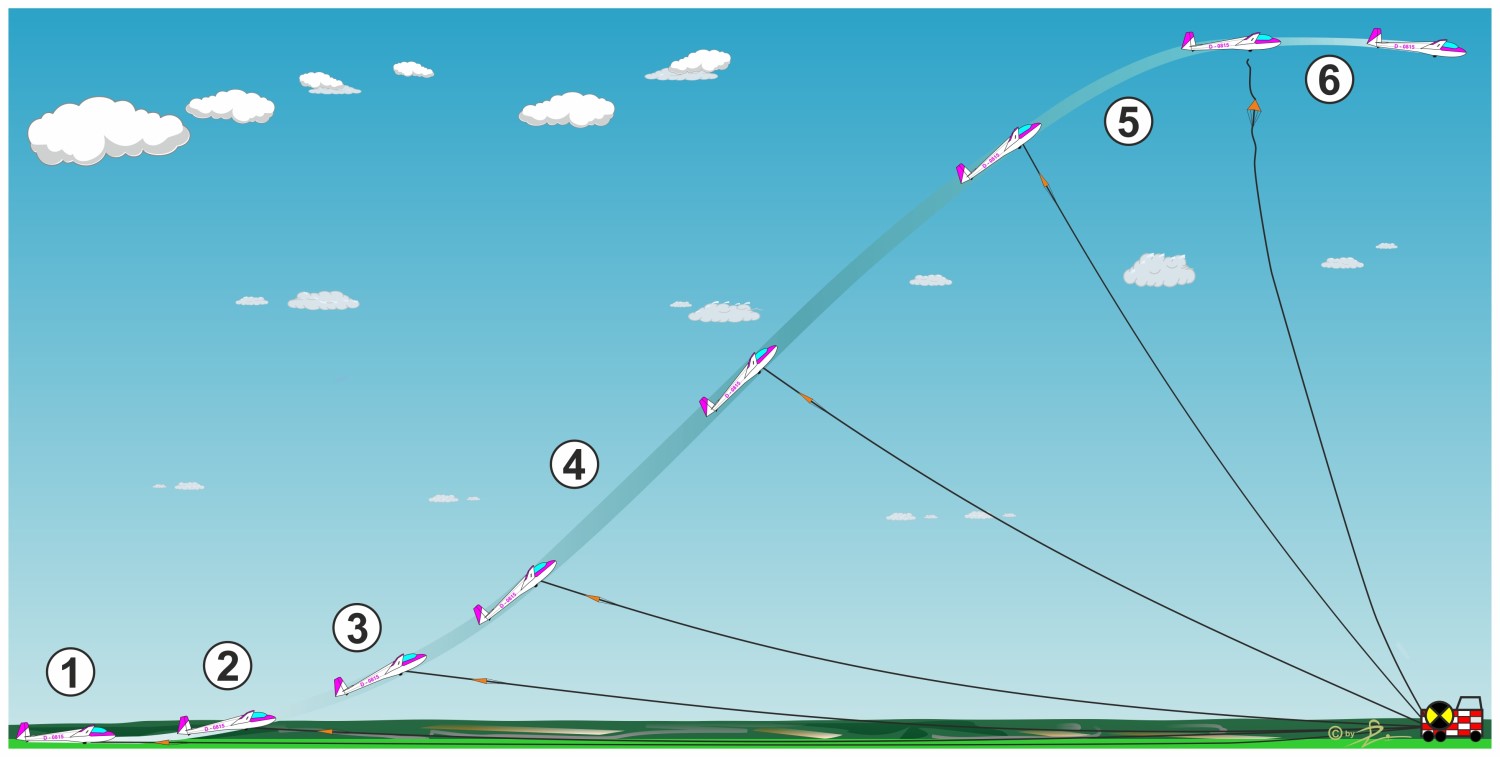 Wenn du zu langsam geschleppt wirst, musst du den Steuerknüppel nachlassen. Du meldest deine Fluggeschwindigkeit über Funk. Der Windenfahrer gibt jetzt Gas, deine Geschwindigkeit erhöht sich und du kannst den Steuerknüppel wieder allmählich anziehen.