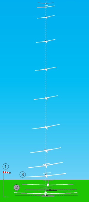 Nach dem Erreichen der Normalsteigfluglage beginnst du allmählich mit dem Vorhalten. Behutsam mit Quer- und Seitenruder gegen den Wind steuern, bis der gewünschte Vorhaltewinkel erreicht wird. Du lässt dabei die Tragfläche gegen den Wind hängen, fliegst dabei schiebefrei und der Faden zeigt auf dich. Hältst du nicht vor, wird das Seil nach dem Ausklinken vom Wind abgetrieben und fällt eventuell über andere Seile oder auch neben das Flugplatzgelände.