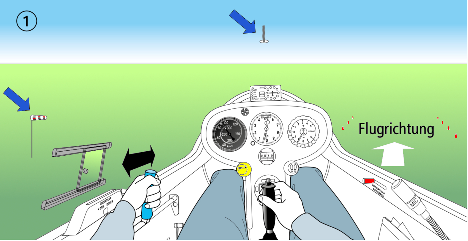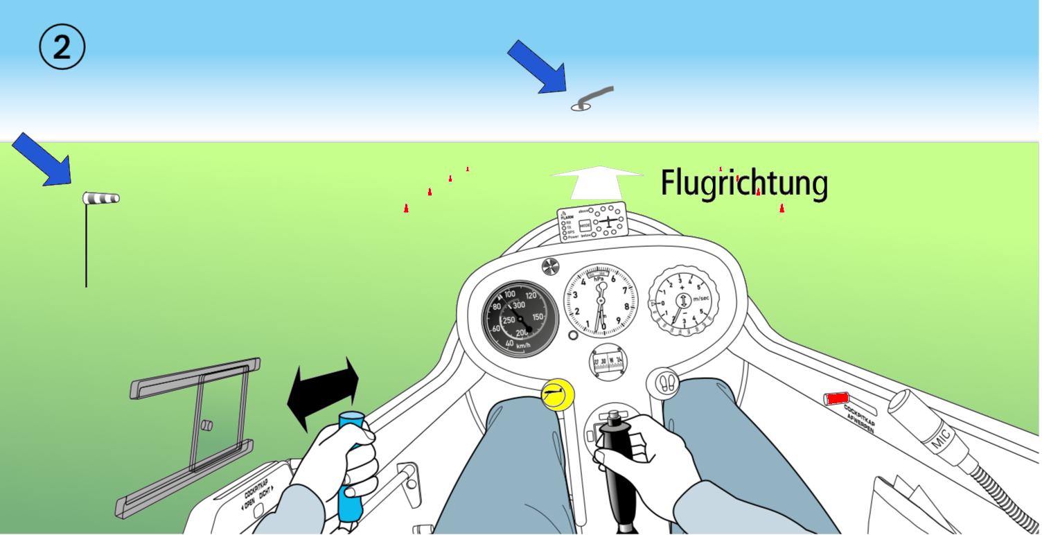Eine andere Vorhaltemethode (2) ist die Landung mit hängender Fläche. Um nicht abgetrieben zu werden, hältst du die dem Wind zugewandte Tragfläche etwas tiefer. Die Segelflugzeuglängsachse wird dabei mit dem Seitenruder in Landerichtung ausgerichtet und gehalten. Bei dieser Methode ist deshalb das Ausrichten des Segelflugzeuges vor dem Aufsetzen nicht erforderlich. Da dies ein Schiebezustand ist, weht der Faden seitlich aus.