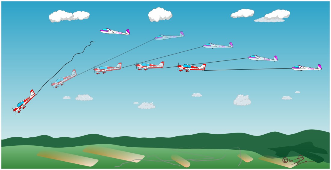 Übersteigt das geschleppte Segelflugzeug die Schleppmaschine zu weit, wird das Heck des Schleppluftfahrzeugs zu weit angehoben, und du musst sofort ausklinken. Gleiches gilt, wenn die Schleppmaschine außer Sicht gerät. Das Schleppluftfahrzeug wird ebenfalls versuchen auszuklinken.