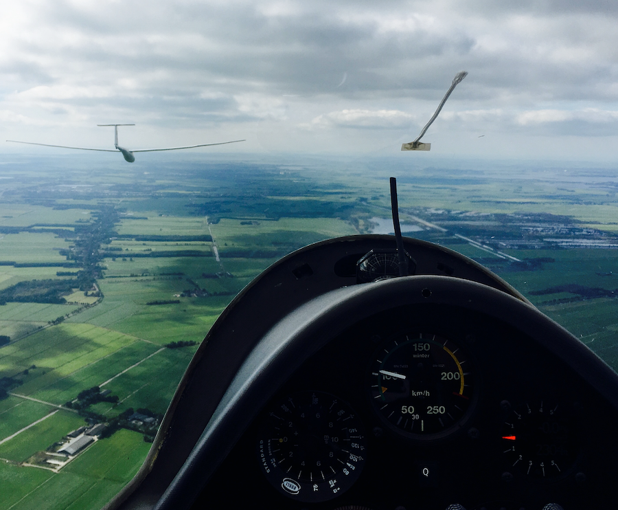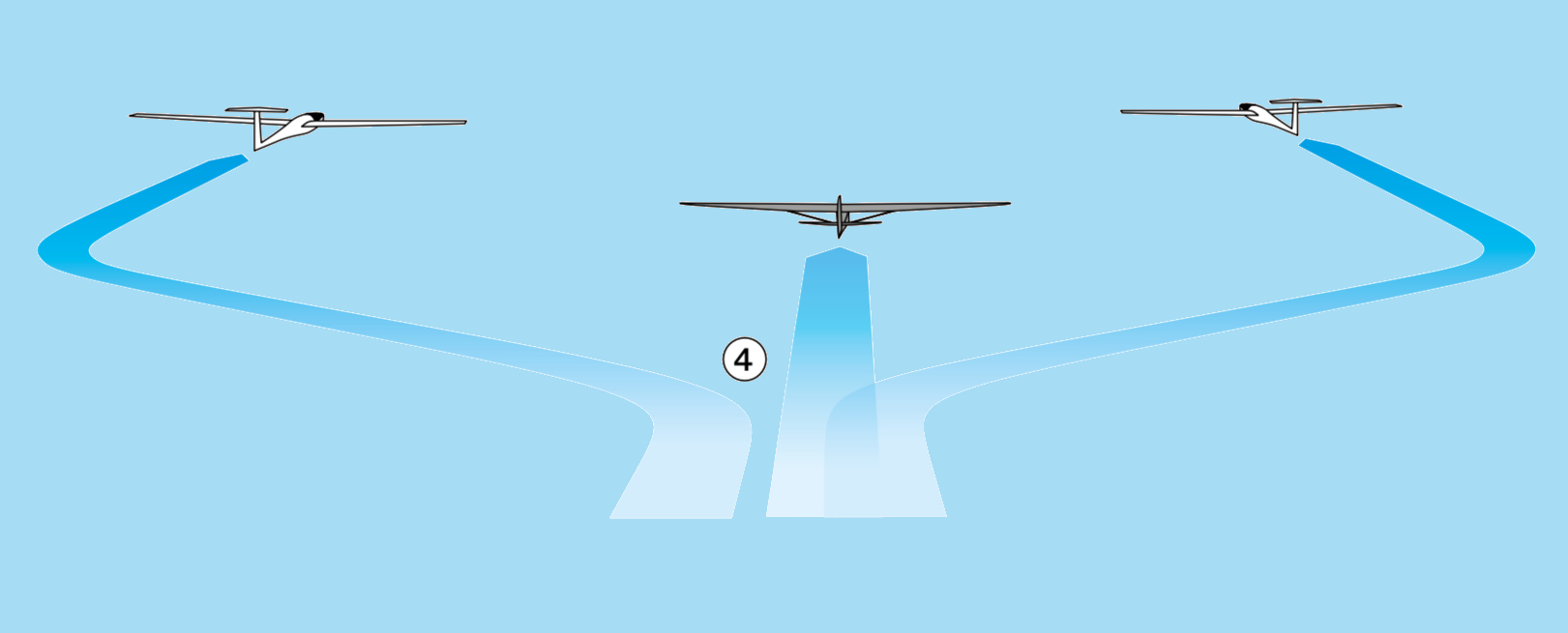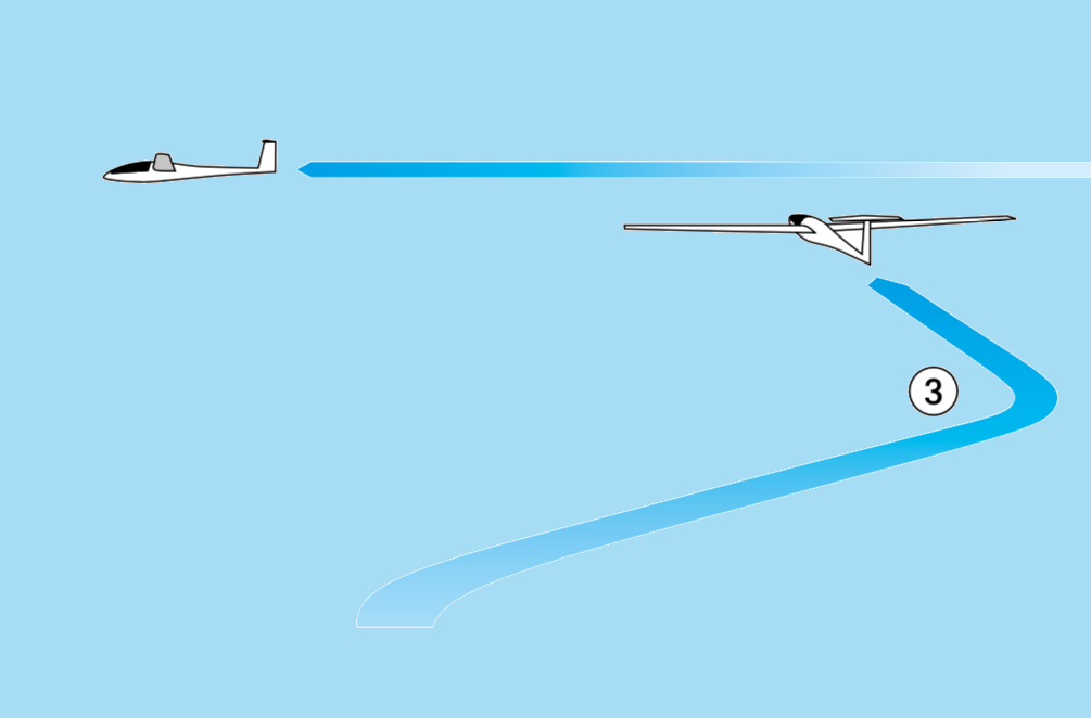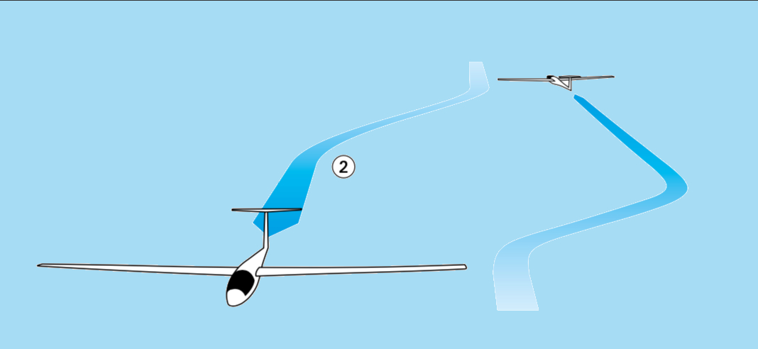 Der Pilot im vorderen Segelflugzeug kann nicht sehen, was unter und hinter ihm fliegt. Wenn er plötzlich eine steile Kurve macht könnte eine gefährliche Situation entstehen.