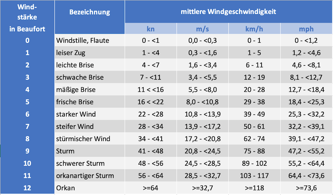 Beziehung der Windstärke in Beaufort zu Windgeschwindigkeiten in gebräuchlichen Einheiten