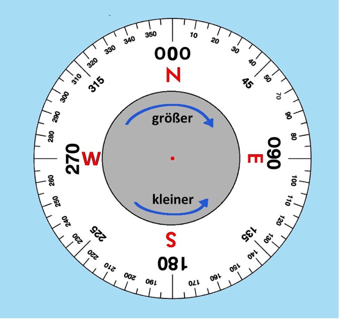 Die Windrichtung wird in Grad der Kompassrose angegeben, z. B. 090 = 90 Grad = Ostwind. Wenn sich der Wind im Uhrzeigersinn dreht, wird der Wert größer. Wenn die Windrichtung gegen den Uhrzeigersinn dreht, wird der Wert kleiner.