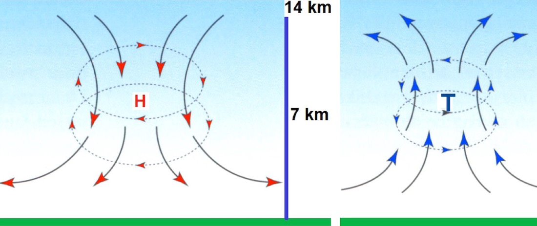 Auf dem Bild oben ist links ein Hochdruckgebiet zu sehen und ein paar hundert Kilometer weiter (im Bild rechts) ein Tiefdruckgebiet. In einem Tiefdruckgebiet strömt die Luft im Bodenbereich ein und verlässt es in der Höhe.