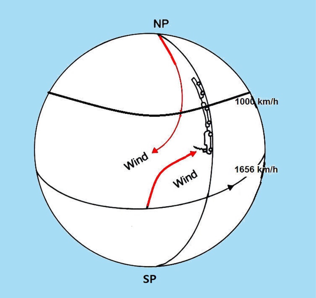 Wenn sich die Erde nicht drehen würde, dann würde sich eine globale Luftzirkulation wie im Bild 3.2.3.1 dargestellt entwickeln: Tropische Luft fließt aus dem thermischen Höhenhoch zum polaren Höhentief und umgekehrt bodennah vom thermischen Kältehoch zum tropischen Bodentief.