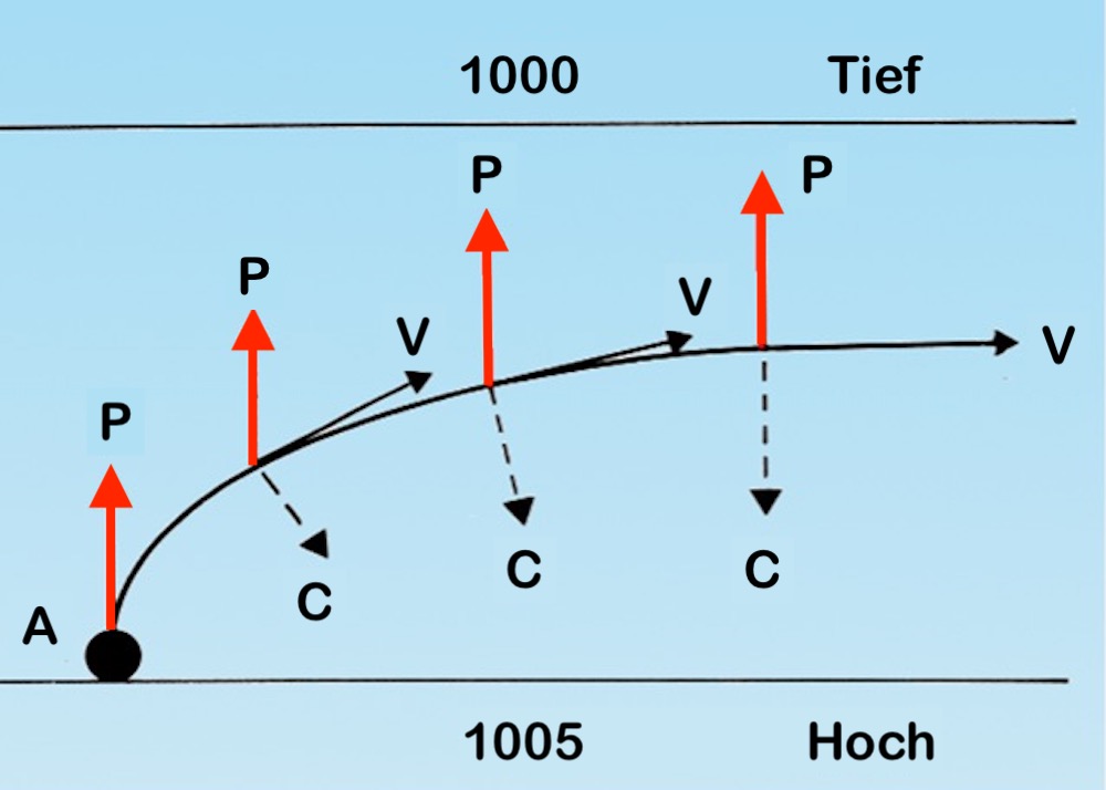 In der Abbildung sieht man, dass sich bei A ein Luftpaket in Bewegung setzt. Aufgrund des Druckgefälles P (Druck) beginnt es von 1005 hPa in Richtung 1000 hPa zu fließen. Sobald die Bewegung begonnen hat, erfährt das Paket eine Abweichung nach rechts durch die Corioliskraft (C). Währenddessen nimmt die Geschwindigkeit (V) zu und die Flugbahn des Luftpakets bewegt sich immer mehr nach rechts, bis sich eine Gleichgewichtssituation zwischen Druckgradient und Corioliskraft einstellt und das Luftpaket fast gleichmäßig zu den Isobaren strömt.