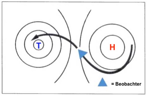 Der Wind dreht, je mehr wir uns vom Erdboden nach oben bewegen, nach rechts und wird stärker, bis zum Isobaren-parallelen Verlauf in ca. 1000m Höhe.