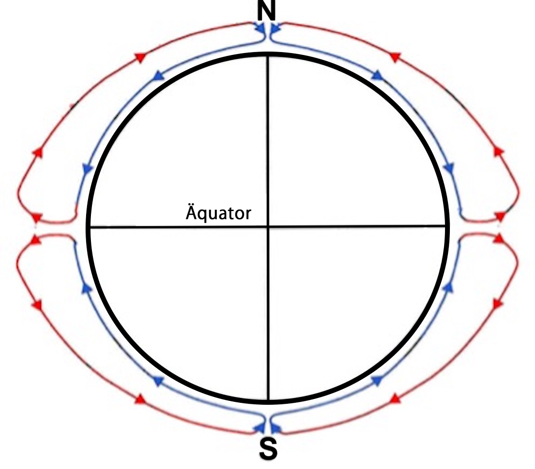 Dieses Modell zeigt die Abweichung nach rechts, wenn die Luft von den Polen nach Süden fließt.