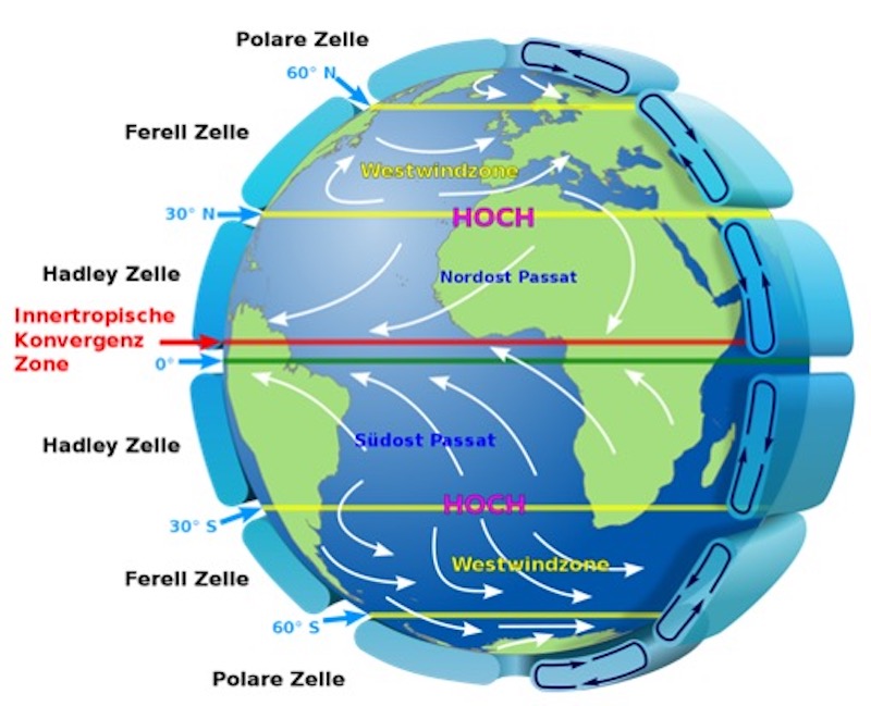 - Die allgemeine Zirkulation der Luft um die Erde findet in drei Zonen statt. In der ersten Zone steigt die Luft am Äquator auf, sinkt am 30. Breitengrad ab und kehrt zum Äquator zurück, während ein Teil in Richtung des sechzigsten Breitengrades geht. In der dritten Zone zieht der Wind von den Polen (Hochdruckgebiet) zum sechzigsten Breitengrad (Tiefdruckgebiet), trifft dort auf warme feuchte Tropenluft und die Luft wird nach oben gedrückt. Ein Teil davon fließt zurück zum Pol und ein Teil geht in Richtung Äquator. So wird die zweite Zone zwischen dem 30. und 60. Breitengrad gebildet.
