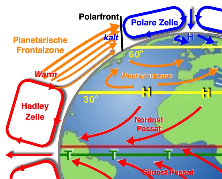 Gliederung der atmosphärischen Luftzirkulationen in Hadley-Zelle (Tropenzelle mit Passatzone), Farell-Zelle (Westwindzone, Planetarische Frontalzone) und Polare Zelle (Polares Hochdruckgebiet)
