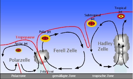 Auf der warmen Seite der Polarfront weht unterhalb der Tropopause / in einer Höhe von etwa 10 Kilometern ein sehr starker Wind von West nach Ost. Der Wind ist Folge der großen Temperatur- und Druckgegensätze in dieser Höhe und hat eine Geschwindigkeit von mehr als 100 km/h bis sogar 500 km/h. Dieser Wind wird als „Jetstream“ bezeichnet, ist einige hundert Kilometer breit und folgt als „Polarer Jetstream“ auf der warmen Seite der mäandernden Polarfront.