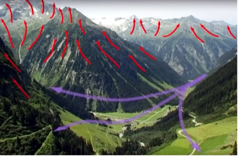 - Anabatische Winde (Hangaufwinde) entstehen, weil die Sonne den Berghang erwärmt. Es gibt Thermik und aus dem Tal strömt Luft den Berg hinauf. Am Abend und in der Nacht kühlen die Hänge ab, die Luft wird kälter (schwerer) und fließt vom Berg ins Tal. Dies wird als katabatischer Wind (Hangabwind) bezeichnet.