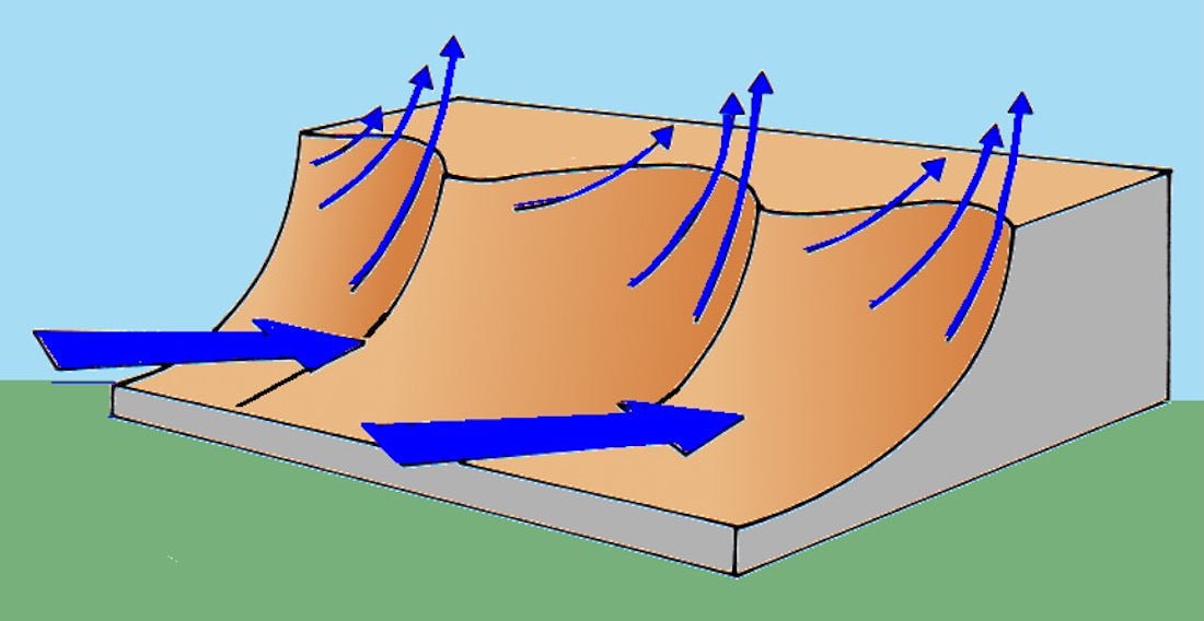 Horizontale Windscherungen treten an vertikalen Hindernissen wie Bäumen oder Gebäuden, aber auch Bergen auf.
