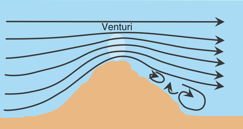 - Im Gebirge wird der anströmende Wind durch die Berge gezwungen, bergauf zu wehen. Auf der Luvseite wird Hangwind erzeugt. Die Höhe, bis zu der der Wind über den Hanggrat aufsteigt, wird als Einflusshöhe bezeichnet. Durch den Venturi-Effekt ist die Windstärke dort deutlich größer als kurz vor oder nach dem Berggipfel.
