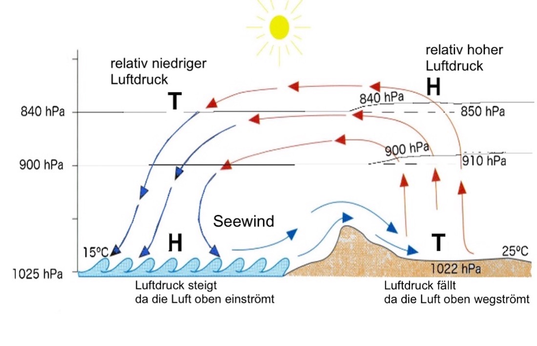 - Seewind tritt auf, wenn es keinen oder nur sehr wenig Wind gibt und wenn große Temperaturunterschiede zwischen dem Land und dem kalten Meerwasser bestehen. Warme Luft über dem Land steigt auf und strömt in der Höhe zum Meer. Am Boden weht die kühlere Luft vom Meer zum Land.