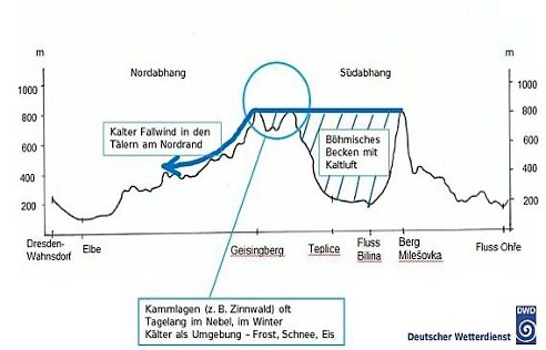 Die Randgebirge, die Böhmen an drei Seiten umgeben, verhindern das Abfließen der schwereren Kaltluft nach Süden, Westen und Norden; nur wo diese Gebirge Passlagen oder Durchbruchstäler haben, ist ein Druckausgleich möglich. Dort strömt die in Böhmen liegende Luftmasse als kalter „Böhmischer Wind“ ins Umland.