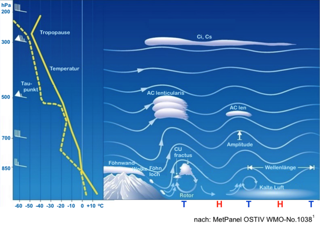 - Lenticulariswolken (linsenförmige Wolken) zeigen an, dass eine Welle vorhanden ist. Oft bildet sich in der Nähe des Berggipfels eine Kammwolke, und auf der Leeseite, wo es sehr turbulent ist, Rotorwolken. Bedingungen für die Welle sind: