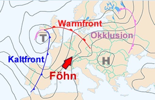 Lage ausgeprägter Hoch- und Tiefdruckgebiete als Ursache für die Richtung der Föhnströmung