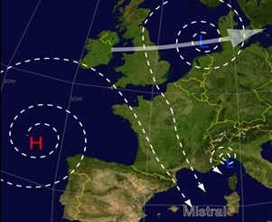 Bei dem Mistral handelt es sich um einen kalten Nordwind, der zwischen den französischen Alpen und dem Zentralmassiv der Alpen durch das Rhonetal weht.