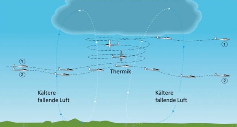 Aufsteigende Thermikblasen verursachen immer auch Bereiche mit absinkender Luft, so dass ein meist ein Nebeneinander von Auf- und Abwinden herrscht. Dieser Sachverhalt wird in der nachfolgenden Abbildung dargestellt.