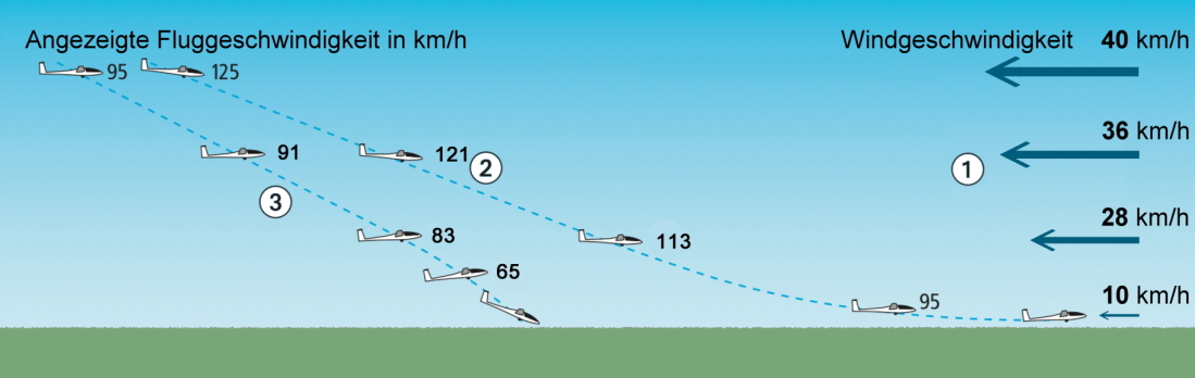 Je stärker der Wind desto höher der Effekt. Bei sehr starkem Wind sollte aufgrund zu erwartender starker Turbulenzen der Segelflug eingestellt werden.