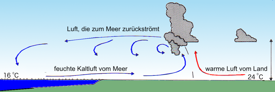 Durch die Erwärmung der Luft über dem Land dehnt sich die Luft aus, das Volumen der Luftsäule vergrößert sich. In der Höhe strömt die Luft in Richtung des niedrigeren Druckgebiets über dem Meer. Dadurch entsteht ein niedrigerer Druck über der wärmeren Landoberfläche, ein thermisches Tief.
