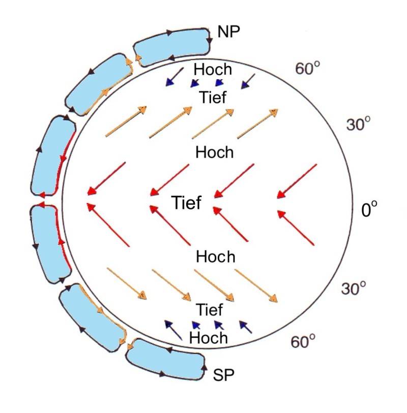 In der Nähe des Äquators befindet sich ein Tiefdruckgebiet (Äquatorialer Tiefdruckgürtel) und in der Nähe der Subtropen (30. Breitengrad), wo die aus den Tropen kommende Luft absteigt, befindet sich fast ständig ein Hochdruckgebiet (über dem Atlantik: Azorenhoch). Diese Zonen verschieben sich mit dem Wechsel der Jahreszeiten.