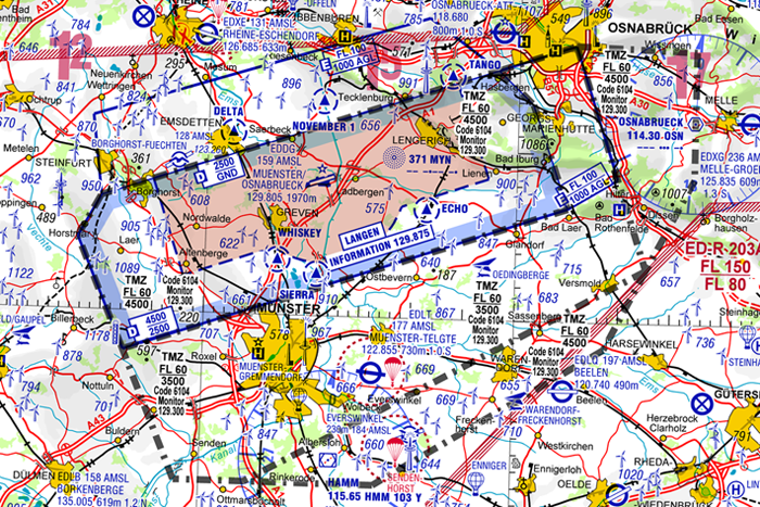 Wenn du von Coesfeld nach Osten fliegst, kommst du auch in die Nähe des Flughafens Münster/Osnabrück an. Du kannst auf der VFR-Karte sehen, dass du dich der TMZ, die sich zwischen 3500 und FL60 erstreckt, näherst.
