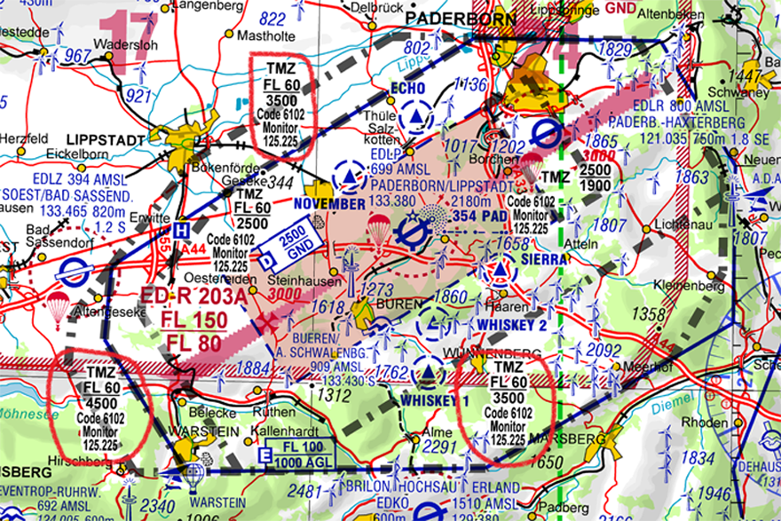 Die aktuellen VFR-Karten zeigen den Squawk-Code und die zugehörige Frequenz der TMZ. Wenn du von Oelde-Bergeler nach Münster-Telgte fliegst, musst du auf 129.300 hörbereit sein und den Transponder auf SQUAWK 6104 einstellen, sofern du zwischen 3500ft und FL60 fliegst.