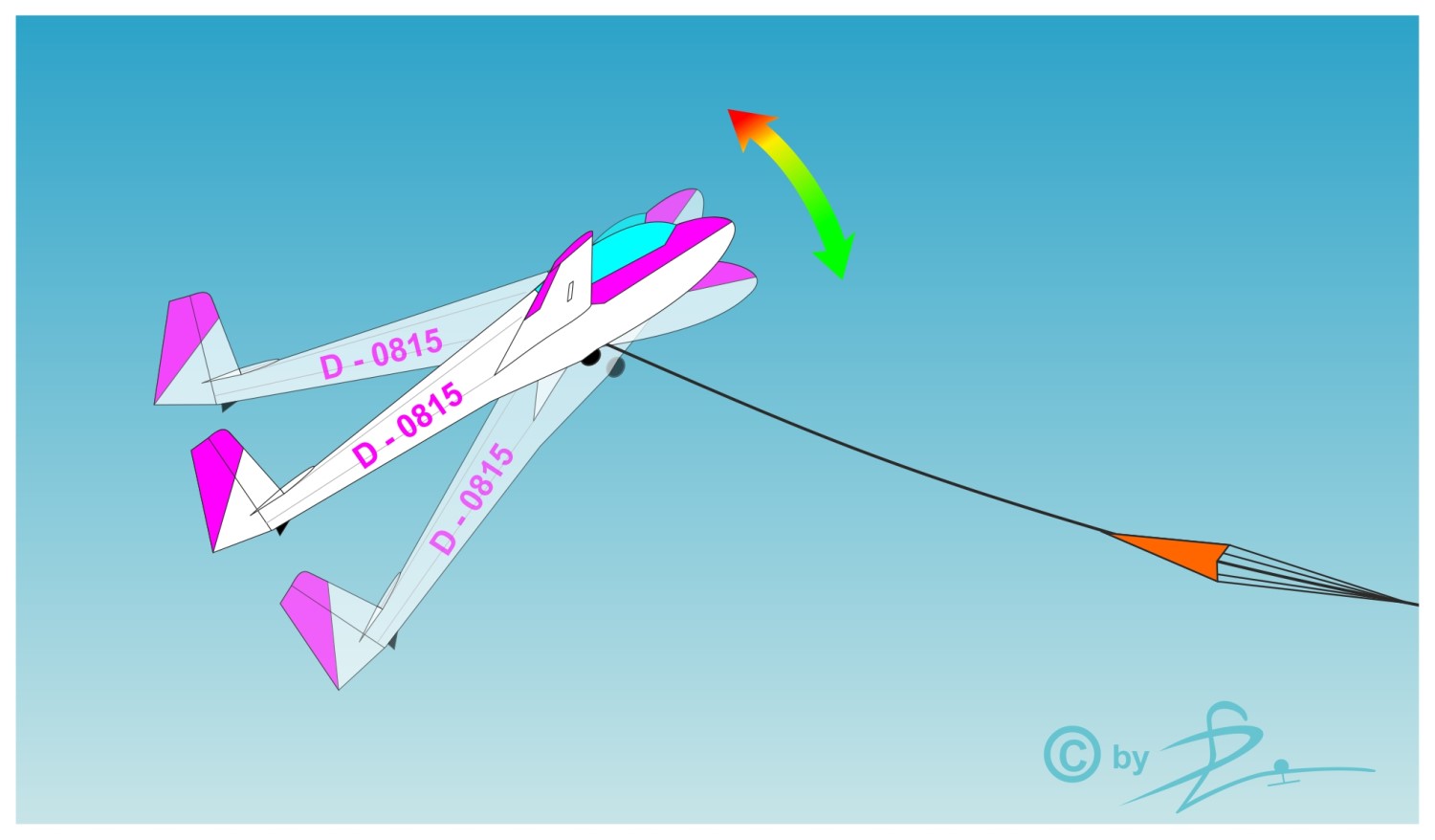 Höhenruderausschlag je nach Segelflugzeugmuster (neutral bzw. gedrückt).