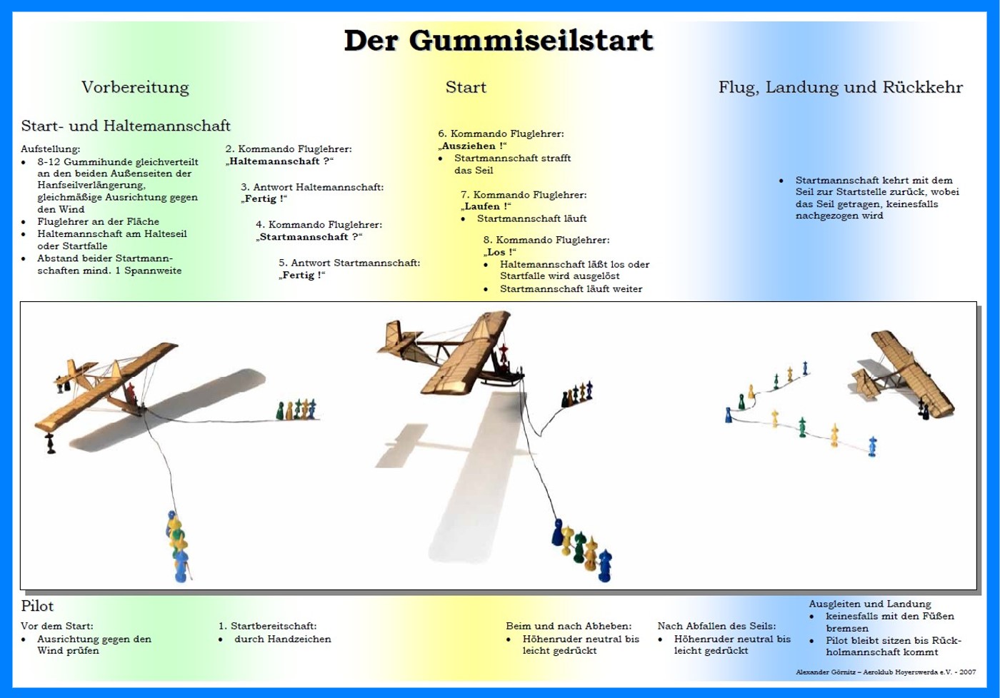 Nachdem der Pilot seine Startbereitschaft signalisiert, werden folgende Kommandos vom Startleiter gegeben: