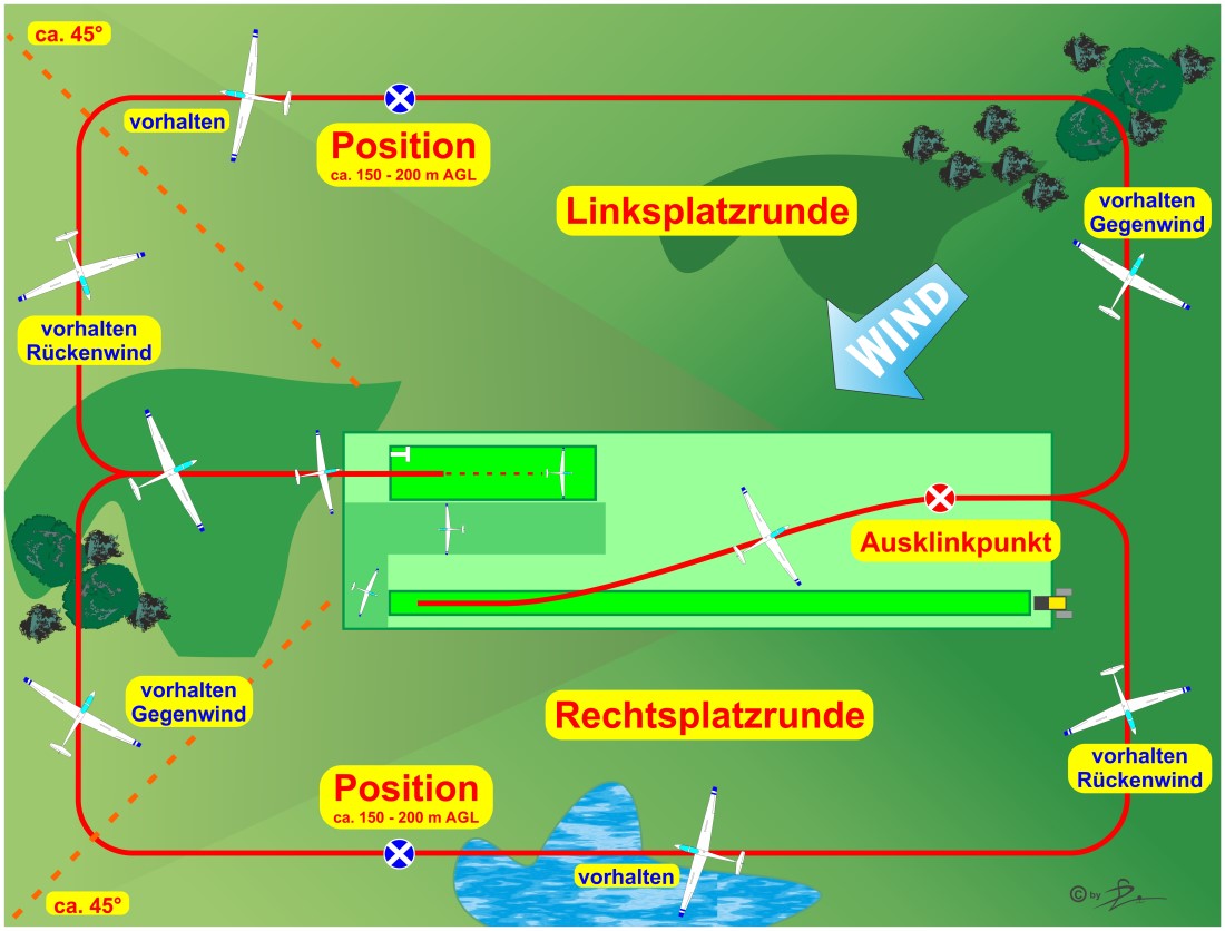 Segelflugplatzrunde - in Deutschland haben die meisten Flugplätze mit Segelflugbetrieb vorgeschriebene Platzrunden genehmigt und veröffentlicht. 6.4.1.1 Segelflugplatzrunde