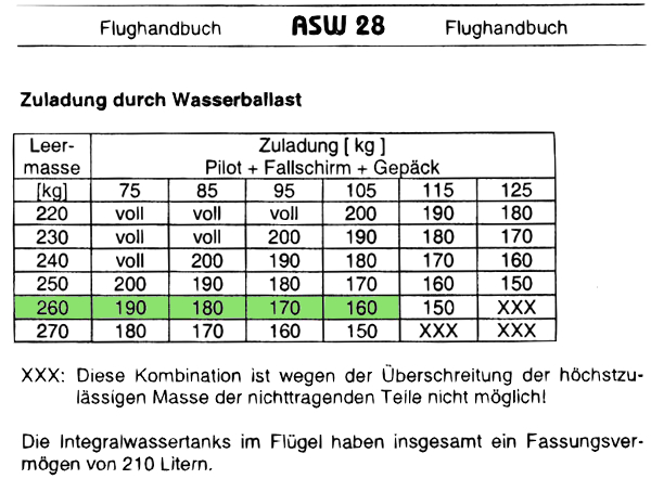 Die Tabelle unten gibt an, wie viel Wasserballast bei einer ASW 28 in Abhängigkeit von der Leermasse und der Zuladung im Cockpit (Pilot + Fallschirm + Gepäck) maximal mitgeführt werden darf. Die Zahlen ergeben sich aus der maximal zulässige Flugmasse von 525xkg, die nicht überschritten werden darf.