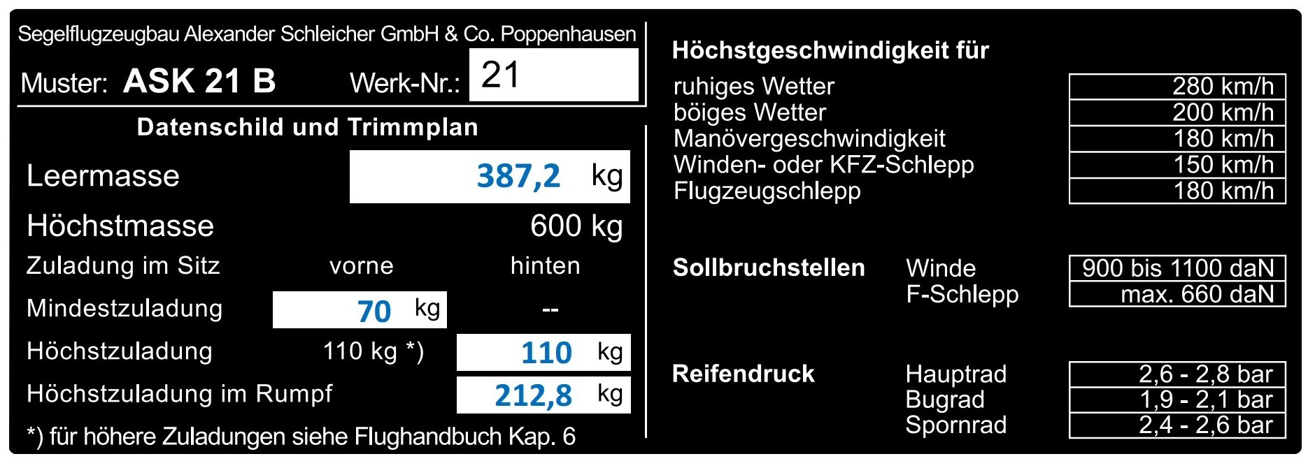 Die Werte für die Mindest- und Maximalzuladung sind für jedes Segelflugzeug verschieden und müssen dem aktuellen Wägebericht oder dem Aufkleber im Cockpit mit den gültigen Betriebsgrenzen entnommen werden.