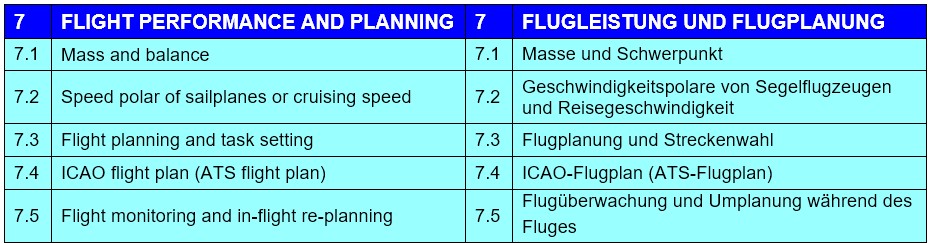 Der Inhalt des Theoriefachs „Flugleistung und Flugplanung“ gliedert sich in die folgenden Abschnitte: