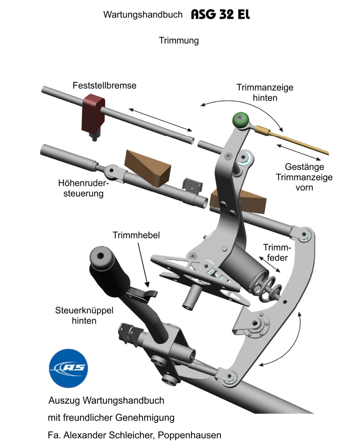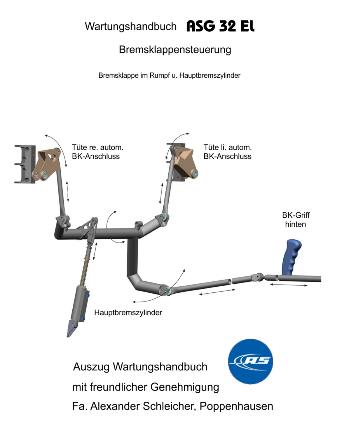 Die Bremsklappen sind über Gestänge, Führungen, Kniehebel und Schnellkupplungen mit dem blauen Bremsklappenhebel auf der linken Seite des Cockpits verbunden.