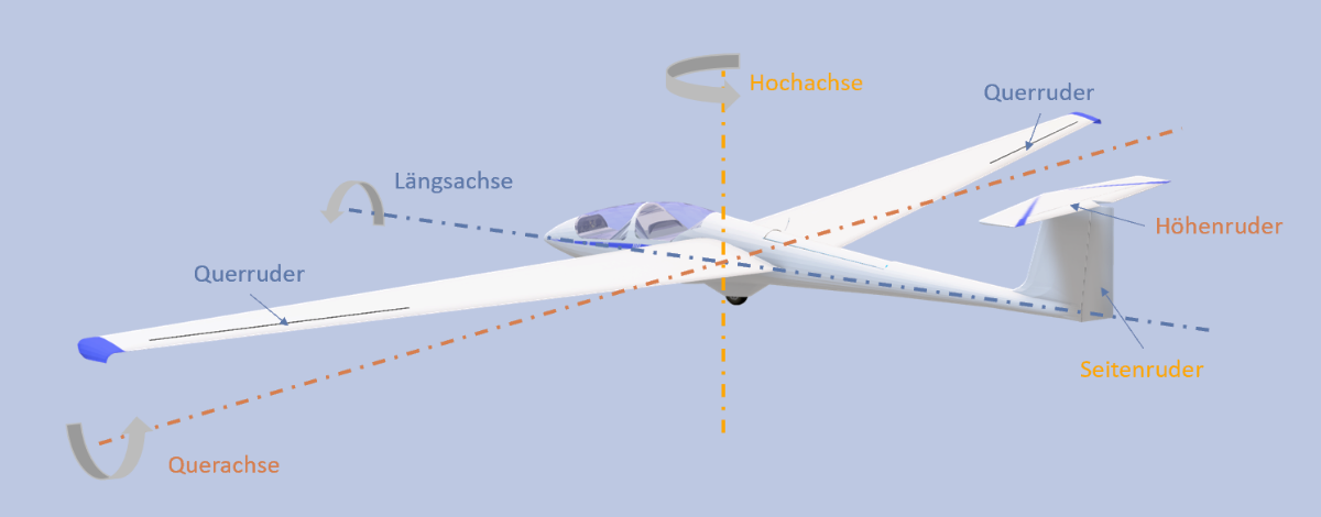 Mechanik der Übertragung von Steuerbewegungen an den Bedienelementen auf Ruder und Klappen. Welche Bewegungen um die Achsen werden als Rollen, Nicken und Gieren bezeichnet, mit welchem Ruder werden sie ausgeführt?