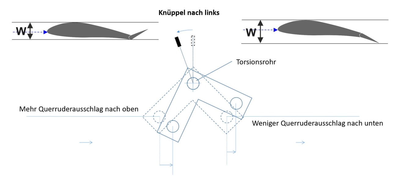Um das negative Wendemoment etwas zu vermindern, ist es also nützlich, das Rollmoment mehr durch den negativen als durch den positiven Ruderausschlag zu erzeugen