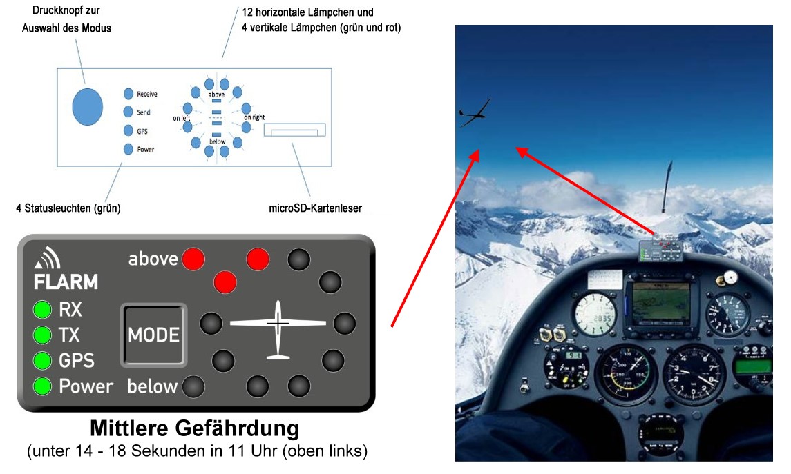 Im Prinzip ist FLARM immer eingeschaltet. Auf dem Bedienfeld befindet sich eine Modus-Taste, mit der verschiedene Einstellungen vorgenommen werden können (Lautstärke, Art der Warnung, Test usw.). Zusätzlich gibt es eine Reihe von "Status"-Leuchten. Der wichtigste Teil ist jedoch der Anzeigebildschirm, der aus einer vertikalen und einer kreisförmigen Reihe von roten und grünen Leuchtdioden besteht. Diese werden in Bezug auf ein (eigenes) Flugzeugsymbol gruppiert. Die vertikalen LEDs zeigen den relativen Höhenunterschied an; die kreisförmigen LEDs zeigen den relativen Richtungsunterschied an (siehe Abbildung).