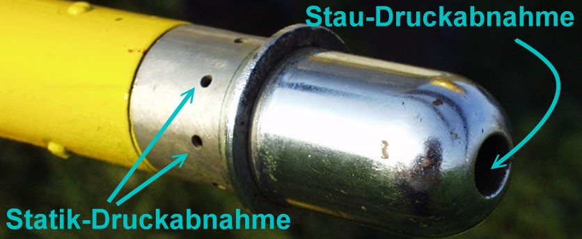 Gesamt- und statische Druckabnahme können auch in einer separaten Vorrichtung kombiniert werden, dem Staurohr (Prandtl-Rohr).