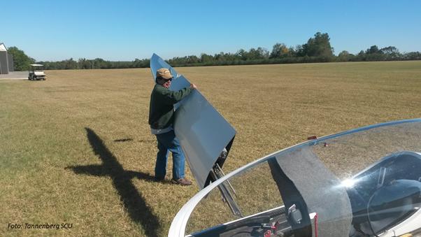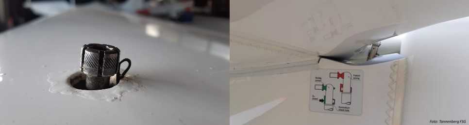 - Nach der Montage der Tragflächen und des Leitwerks empfiehlt es sich, die Ruder sofort anzuschließen. Obwohl Flügel, Leitwerke und Ruder bei modernen Segelflugzeugtypen immer häufiger automatisch oder mit Schnellverschlüssen verbunden werden, werden in einigen Fällen noch lose Schrauben mit Muttern und Splinten und/oder Fokker-Nadeln verwendet.