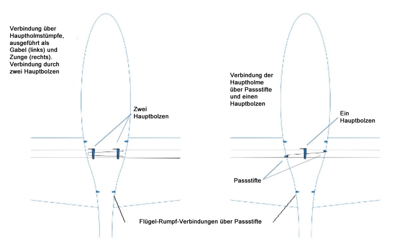 Im Rumpf sind die Holme der beiden Flügelhälften durch lösbare Verbindungen, den sogenannten Hauptbolzen, fest miteinander verbunden.