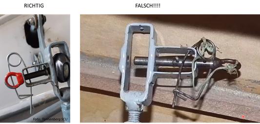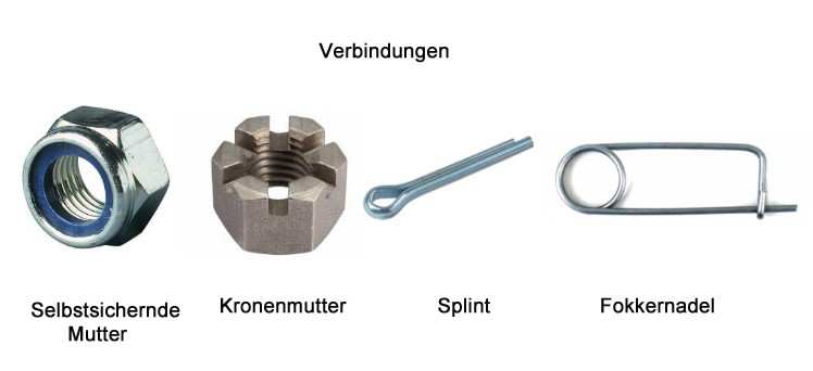 Auch werden bei älteren Flugzeugmustern die Rudergestänge mit Fokkernadeln gesichert. Wie hier im Beispiel einer Ka8 müssen die Fokkernadeln durch das Loch im Bolzen gesteckt werden und nicht daran vorbei. Solche Fehler haben in der Vergangenheit bereits zu tödlichen Flugunfällen geführt.