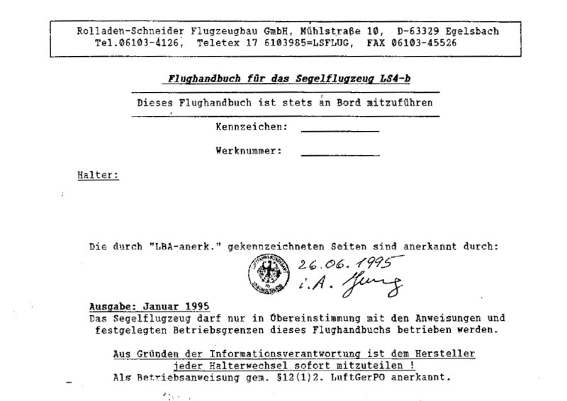 Da es sich beim Flug- und Betriebs-/Wartungshandbuch um eine von der Zulassungsbehörde anerkannte Betriebsanweisung des Segelflugzeugs handelt, darf es auch nur mit deren Einverständnis geändert werden.